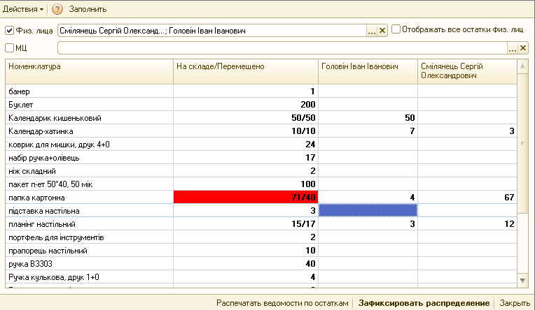 В левой части отображается общий не распределенный остаток МБП на складе, отдельными колонками те МОЛы, на которых будет созданы перемещены те ТМЦ. Пользователь в колонке с МОЛом задает количество, которое должно быть ему передано . Система контролирует общий остаток и текущее распределение. Результатом обработки являются групповое создание документов «передача малоценки в эксплуатацию» с возможным распечатывнием акта ввода в эксплуатацию.