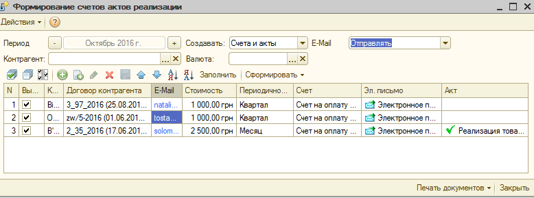 Обработка позволяет отслеживать и создавать, по каждому контрагенту и договору из регистра, какие счета, акты уже созданы в заданном периоде и отправлено ли по ним электронное письмо с вложенным счетом на оплату в формате PDF.