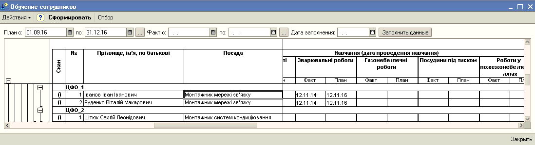 Разворот по вертикали идет по видам работ. Обработка позволяет вводить даты по каждому сотруднику, данные будут сохранятся в соответствующем регистре сведений. В колонке "скан", можно отображается наличие файлов из карточки сотрудника по обучению, их можно открыть из данной формы.