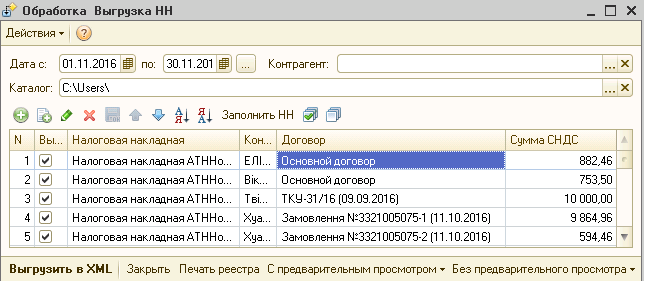 Обработка по выгрузка налоговых накладных и приложений №2 в формате XML. При выгрузке у налоговой проставляется дата выгрузки, чтобы повторно не выгружалась автоматически.