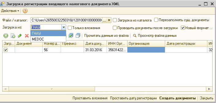 Обработка загрузка входящих налоговых накладных в 2-х форматах ГНАУ и MEDOC