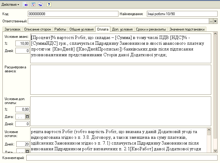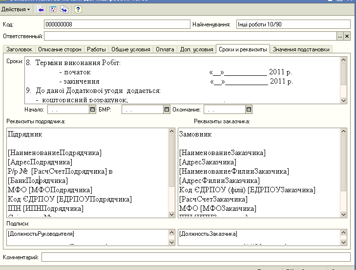 Создан функционал, позволяющий создавать договора и акты из 1с сразу в формате MS Word. Это сделано в случае если не достаточно стандартных средств 1с для формирования печатных форм (например жирный шрифт в середине текста, выравнивание и перенос ).