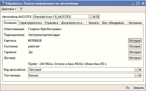 Обработка "полная информация по автомобилю" с данными по текущему состоянию, ответственному сотруднику, страховке, номерами регистрации, затратами на него.
