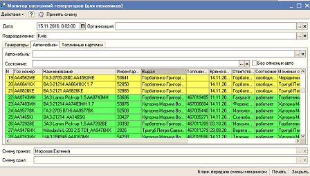 Обработка «монитор механиков» для передачи автомобилей, генераторов, просмотру и изменению текущего состояния
