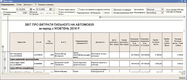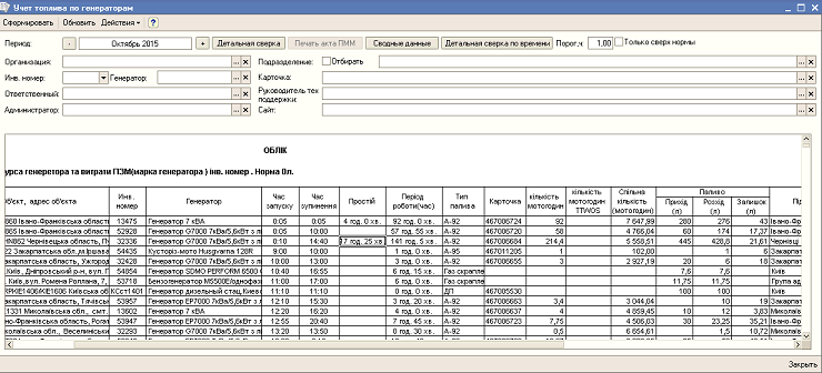 Отчеты по списанию топлива генераторов, сводный по автопарку.